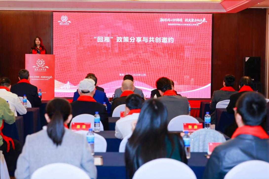 2025年12月12日上午,我校2025年校友工作年会在海口召开。本次年会以 “湘琼同心织锦绣 校友聚力向未来”为主题,学校校友工作负责人、各地方校友分会负责人及校友代表、特邀校友代表等近50人齐聚一堂,共忆求学岁月,共话学校发展,共商校友事业新篇章。学校党委副书记、校长魏晓林,党委委员、副校长聂东明出席会议,湖南省政府驻海南办事处副主任祝拥军到场致辞。