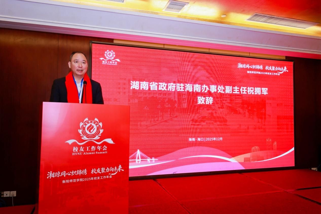 湖南省政府驻海南办事处副主任祝拥军在致辞中祝贺年会召开,并充分肯定我校办学历史悠久、育人成果丰硕,为湖南乃至全国培养了大批优秀人才。他指出,我校广大校友扎根海南,服务两地,已成为推动湘琼交流合作与自贸港建设的重要力量。他强调,当前湘琼两省合作日益紧密,为校友事业发展提供了广阔舞台,他希望我校广大校友继续发挥桥梁纽带作用,把握机遇、积极作为,共同谱写湘琼协同发展新篇章。