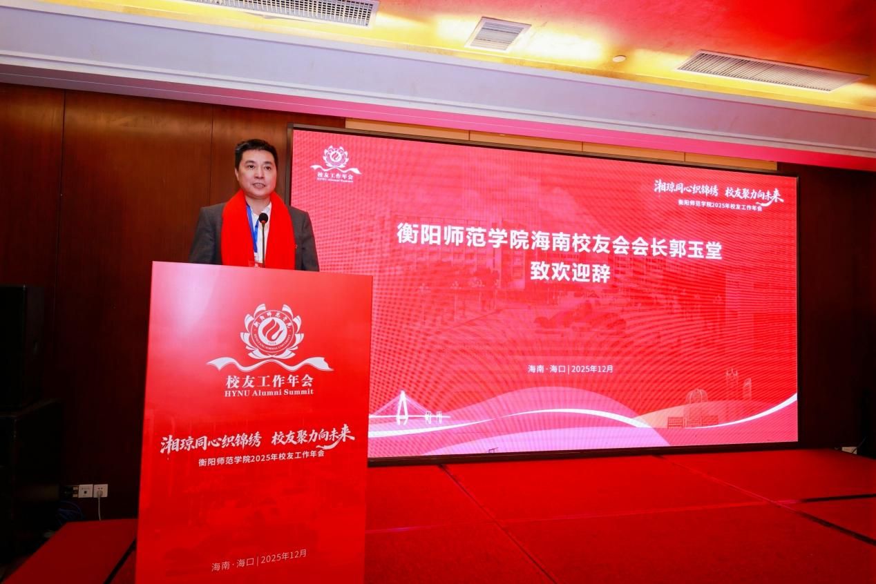 随后,衡阳师范学院海南校友会会长郭玉堂致欢迎辞。他代表海南校友会,向远道而来的各位领导、各地校友嘉宾表示热烈欢迎和诚挚问候,分享了海南校友会的建设历程与工作成效,并表示将持续搭建优质校友交流平台,为母校发展与校友互助添砖加瓦,让这场跨越湘琼两地的相聚更具温度与意义。