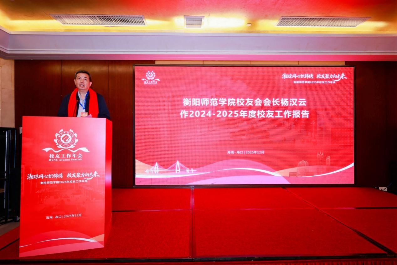 衡阳师范学院校友会会长杨汉云代表第三届理事会作年度工作报告,系统总结过去一年工作成效,并提出下阶段将围绕“联、服、融、育”持续发力,提升校友工作整体水平。